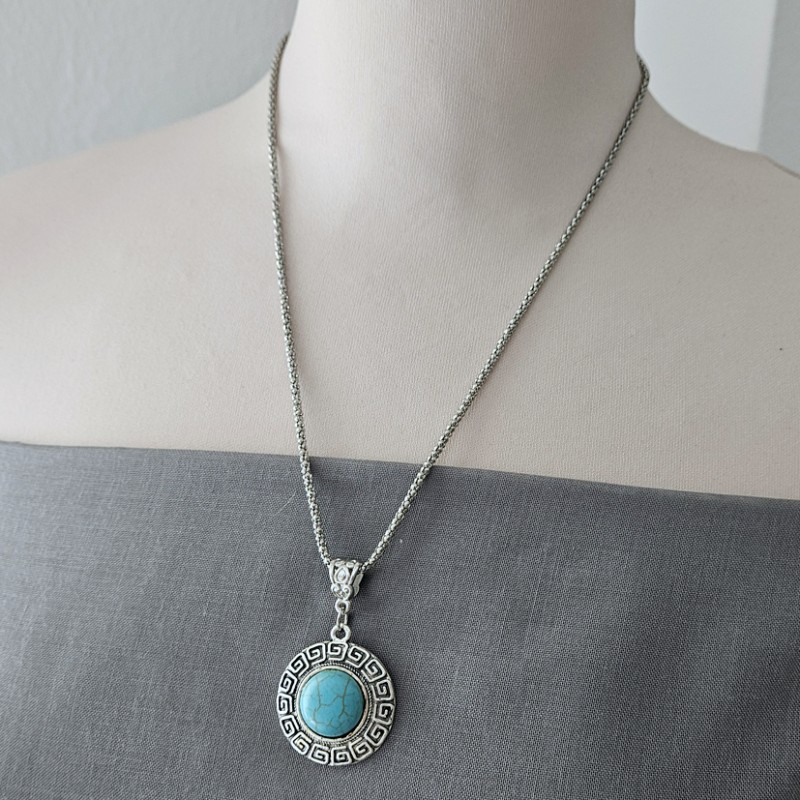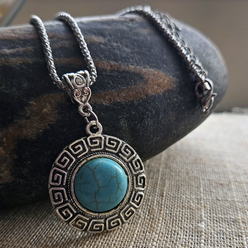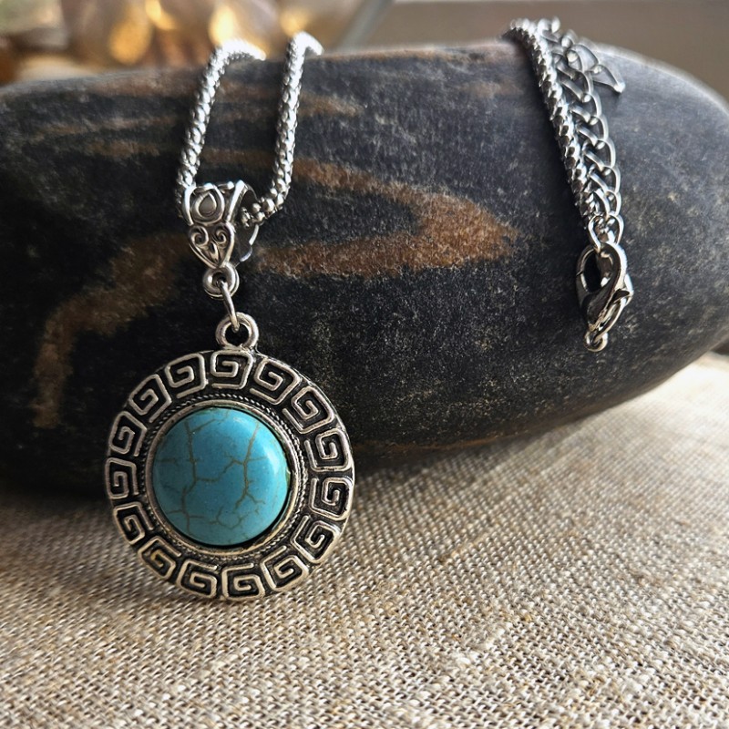 Collar de inspiración griega, elaborado a mano, utilizando plata tibetana como base y piedra acrílica de ágata, como ornamento, un accesorio perfecto para lucir a diario.