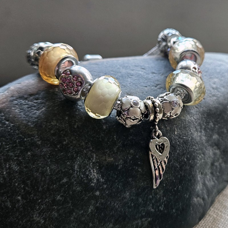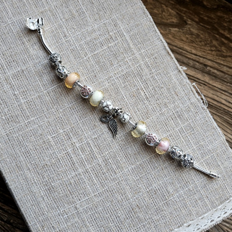 Pulsera de charms y abalorios, con elementos elaborados en plata tibetana, plata 925 y aleaciones varias, la belleza y el detallismo de cada pieza, viene remarcado por los refinados micro cirstales de zirconita, engastados en las piezas, combinados con el colorido y elegante cristal de tipo murano, la pulsera perfecta para regalar, por sus detalles y belleza son piezas que querrás tener y coleccionar.