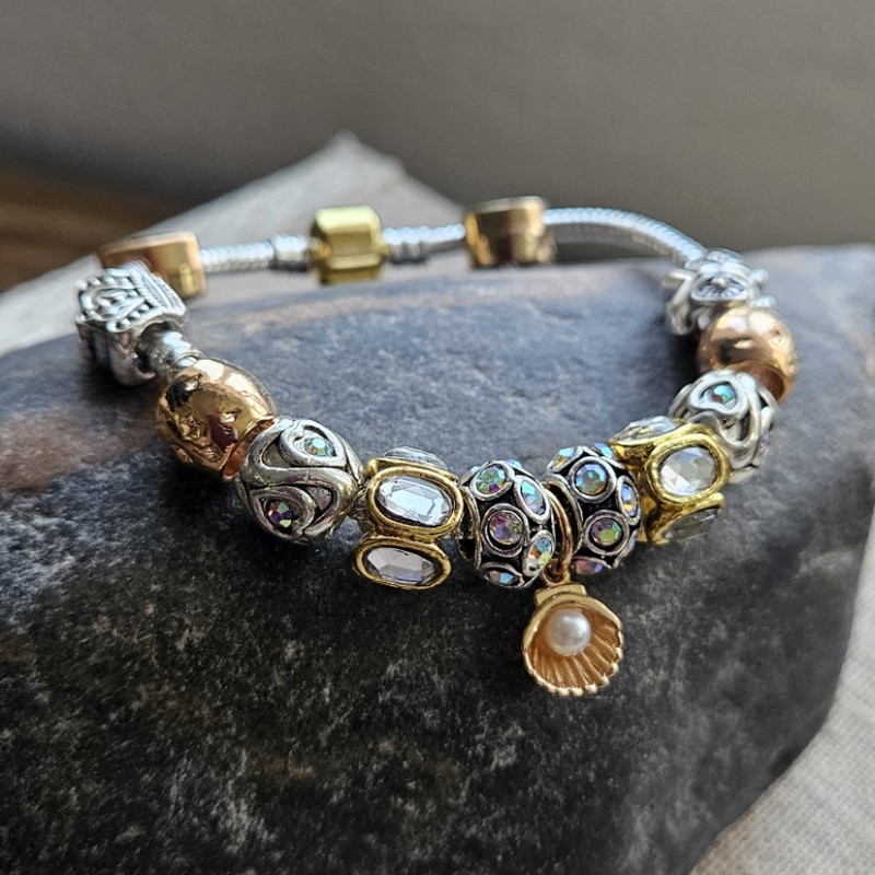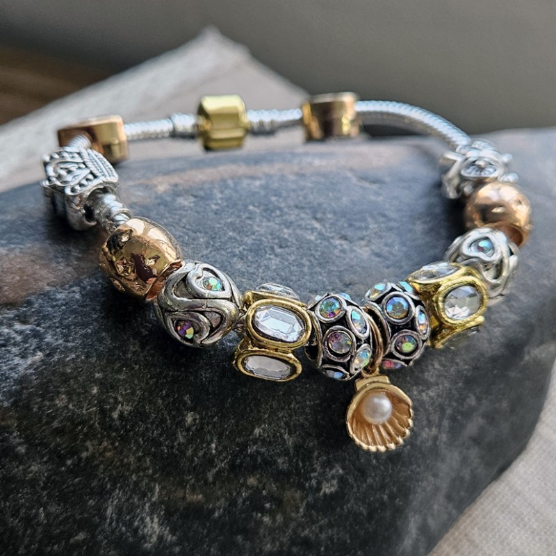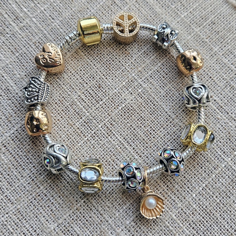 Pulsera de la suerte de charms y abalorios con temática de amor, paz y esperanza, los charms están elaborados en plata tibetana, plata 925 y decorados con micro cristales engastados y otros elementos con gran detalle y belleza visual, aportando ala pulsera una armonía perfecta entre lo visual y lo sentimental, ideal para regalar y hacer especial y único cualquier look.